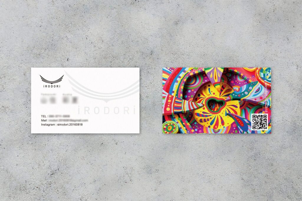 この名刺は、その両面の要素を一枚に共存させた、iRODORiさんのアイデンティティを体現するデザインです。